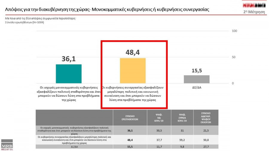 Πάμε τώρα στην μεγάλη εικόνα του καυτού ερωτήματος: «Απόψεις για την διακυβέρνηση της χώρας- Μονοκομματικές κυβερνήσεις ή κυβερνήσεις συνεργασίας;». Η συντριπτική πλειοψηφία των πολιτών, το 48% εκτιμά ότι οι κυβερνήσεις συνεργασίας εξασφαλίζουν μεγαλύτερη πολιτική και κοινωνική συναίνεση και έτσι μπορούν να δώσουν λύση στα προβλήματα της χώρας. Υπάρχει βέβαια και ένα ποσοστό 36,1% που πιστεύει ότι οι ισχυρές μονοκομματικές κυβερνήσεις εξασφαλίζουν πολιτική σταθερότητα και έτσι μπορούν να δώσουν λύση στα προβλήματα της χώρας.