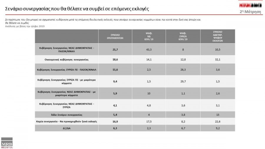Ιδιαίτερης μελέτης χρήζουν οι απαντήσεις που αφορούν τα σενάρια συνεργασίας που θα ήθελαν οι πολίτες να συμβούν στις επόμενες εκλογές. Η πλειοψηφία των πολιτών φαίνεται να αντιδρά θετικά σε κυβέρνηση συνεργασίας με κορμό τη ΝΔ και με τη συμμετοχή του ΠΑΣΟΚ/ΚΙΝΑΛ (21,7%) ή ακόμα και με μικρότερα κόμματα (5,9%). Το 27,1% απαντά ότι συμφωνεί σε ένα τέτοιο σχήμα. Από την άλλη μεριά ένα ποσοστό 21% βλέπει με καλό μάτι μια συγκυβέρνηση ΣΥΡΙΖΑ – ΠΑΣΟΚ (11,6%) ή και ΣΥΡΙΖΑ με άλλα μικρότερα κόμματα (9,4%). Αυτό που σίγουρα δεν θέλουν οι πολίτες είναι συγκυβέρνηση ΝΔ με ΣΥΡΙΖΑ, ενώ είναι μικρά τα ποσοστά όσων επιθυμούν μια οικουμενική κυβέρνηση (18,6%). Τέλος υπάρχει και ένα ποσοστό 16,9% που δεν θέλει καμία συνεργασία και θέλει να προκηρυχθούν ξανά εκλογές.