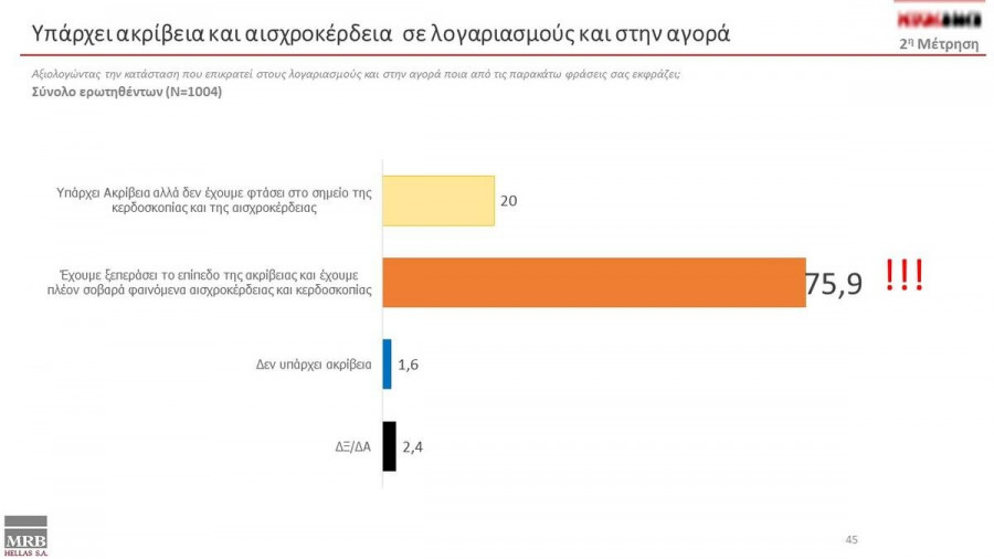 Όταν η Ακρίβεια ως κύριο πρόβλημα εκτοξεύεται από το 48% στο 60% τα πράγματα δείχνουν τεράστια διαχειριστικά θέματα. Τα οποία χειροτερεύουν ακόμα περισσότερο αν αναλογισθεί κανείς ότι πλέον οι πολίτες έχουν προχωρήσει πιο πέρα και έχουν πάει από την αίσθηση της απλής Ακρίβειας στην Αισχροκέρδεια κατά 76%.