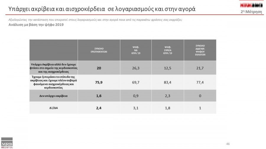 Το γενικό συμπέρασμα των πολιτών είναι ότι όχι μόνο υπάρχει ακρίβεια, αλλά αισχροκέρδεια η οποία έχει ξεπεράσει κάθε όριο. Ποσοστό 75,9% των ερωτηθέντων επισημαίνουν ότι έχουμε ξεπεράσει πλέον το επίπεδο της ακρίβειας και έχουμε μπει σε περιβάλλον αισχροκέρδειας. Κατά 83,4% αυτό το πιστεύουν όσοι το 2019 ψήφισαν ΣΥΡΙΖΑ, αλλά όχι μόνο αυτοί. Ακόμα και όσοι ψήφισαν ΝΔ το 2019 πιστεύουν σε ποσοστό 69,7% ότι υπάρχει σοβαρό πρόβλημα αισχροκέρδειας.