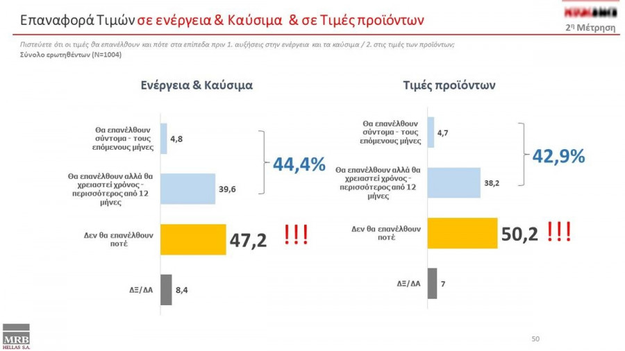 Ανησυχητικό είναι και το γεγονός ότι αρκετοί συμπολίτες μας δεν πιστεύουν ότι θα έχουμε επαναφορά τιμών σε ενέργεια, καύσιμα και σε τιμές προϊόντων. Για την ακρίβεια το 50,2% εκτιμά ότι οι τιμές των προϊόντων δεν θα επιστρέψουν ποτέ σε επίπεδα προ κρίσης.