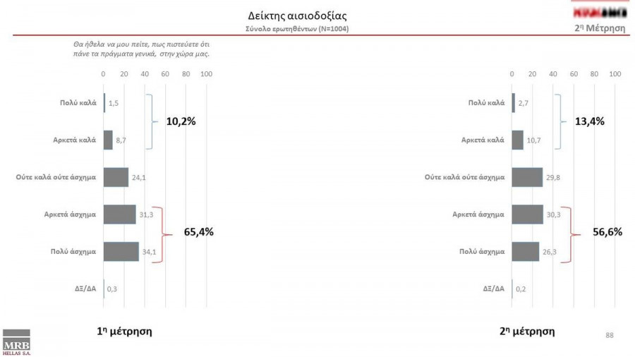 Υψηλοί παραμένουν οι δείκτες απαισιοδοξίας των πολιτών για το πώς πάνε τα πράγματα στη χώρα μας. Το 56,6% των ερωτηθέντων στην δημοσκόπηση της MRB απαντά αρκετά άσχημα και πολύ άσχημα, αν και στην προηγούμενη μέτρηση της εταιρείας που έγινε τον Μάρτιο για το Newsbomb.gr τα ποσοστά απαισιοδοξίας ήταν ακόμα ψηλότερα και άγγιζαν το 65,4%. Συνεπώς, τον τελευταίο μήνα υπάρχει μια σχετική βελτίωση των 9 μονάδων, αν και η αγωνία των πολιτών είναι ακόμα μεγάλη.