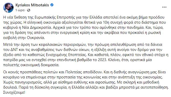«Η νέα Έκθεση της Ευρωπαϊκής Επιτροπής για την Ελλάδα αποτελεί ένα ακόμη βήμα προόδου της χώρας. Η ελληνική οικονομία αξιολογείται θετικά για 10η συνεχή φορά στο διάστημα που κυβερνά η Νέα Δημοκρατία. Αρχικά για τον τρόπο που αμύνθηκε στην πανδημία. Και, τώρα, για τη δράση της απέναντι στην ενεργειακή κρίση και την ακρίβεια που προκαλεί η ρωσική εισβολή στην Ουκρανία.