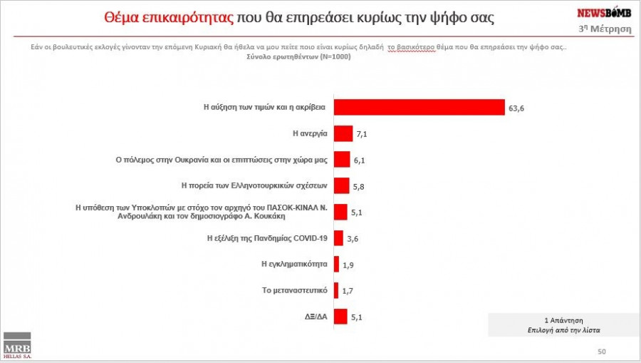 Σε ποσοστό 63,6% οι ερωτηθέντες δηλώνουν ότι η ψήφος τους θα επηρεαστεί από την ακρίβεια. 7,1% θα επηρεαστούν από την ανεργία, 6,1% από τις επιπτώσεις του πολέμου στην Ουκρανία, 5,8% από τις εξελίξεις στα ελληνοτουρκικά και μόνο 5,1% από τις υποθέσεις των παρακολουθήσεων με στόχο τον αρχηγό του ΠΑΣΟΚ Νίκο Ανδρουλάκη και τον δημοσιογράφο Θανάση Κουκάκη.