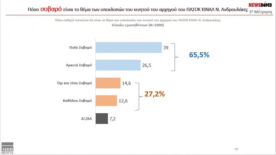 Αν και δεν θα επηρεάσει καθοριστικά την ψήφο τους, οι πολίτες θεωρούν ότι πολιτικά το θέμα των υποκλοπών του κινητού του αρχηγού του ΠΑΣΟΚ ΚΙΝΑΛ Ν. Ανδρουλάκη είναι αρκετά έως πολύ σοβαρό σε ποσοστό 65,5%. Μόνο το 27,2% θεωρεί το θέμα καθόλου έως λίγο σοβαρό.