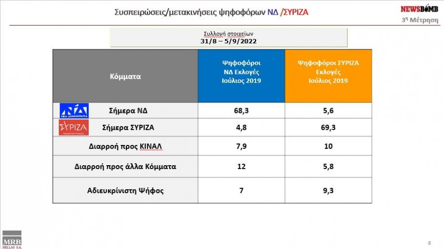 Σύμφωνα με τη δημοσκόπηση της MRB για λογαριασμό του Newsbomb.gr που διενεργήθηκε στο διάστημα 31 Αυγούστου μέχρι 5 Σεπτεμβρίου και άρα περιέχει και τον απόηχο του ζητήματος των παρακολουθήσεων, η ψαλίδα μεταξύ ΝΔ και ΣΥΡΙΖΑ φαίνεται να διαμορφώνεται στο 6,4%.