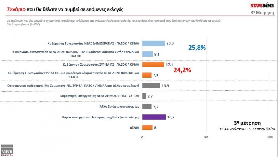 Στην άλλη πλευρά υπάρχει ένα εξίσου υψηλό ποσοστό 24,2% που θέλει συγκυβέρνηση με κορμό τον ΣΥΡΙΖΑ. Συγκεκριμένα το 17,1% επιθυμεί συγκυβέρνηση ΣΥΡΙΖΑ με ΠΑΣΟΚ και ένα ποσοστό 7,1% θα ήθελε συγκυβέρνηση του ΣΥΡΙΖΑ με μικρότερα κόμματα εκτός της ΝΔ και του ΠΑΣΟΚ.