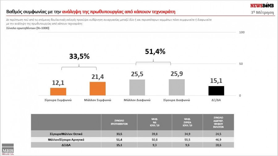 Αυτό που σίγουρα δεν επιθυμούν οι πολίτες είναι κυβέρνηση με κάποιον τεχνοκράτη πρωθυπουργό. Το 51,4% δεν θέλει ένα σενάριο προς αυτή την κατεύθυνση (25,9% σίγουρα διαφωνώ και 25,5% μάλλον διαφωνώ). Μόνο το 33,5% επιθυμεί τεχνοκράτη πρωθυπουργό (21,4% μάλλον συμφωνώ και 12,1% σίγουρα συμφωνώ).