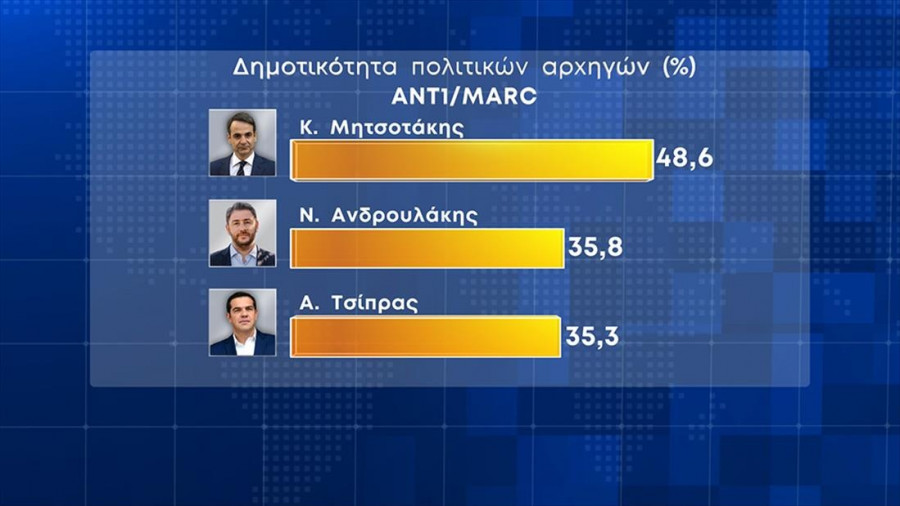 Στη δημοτικότητα των πολιτικών αρχηγών, ο Κυριάκος Μητσοτάκης προηγείται με 48,6% ενώ δεύτερος είναι ο Νίκος Ανδρουλάκης με 35,8% και ακολουθεί ο Αλέξης Τσίπρας με 35,3%. Ο Δημήτρης Κουτσούμπας είναι ο επόμενος με 27,6%, τον ακολουθεί ο Γιάνης Βαρουφάκης με 23,8% ενώ 16,4% συγκεντρώνει ο Κυριάκος Βελόπουλος.