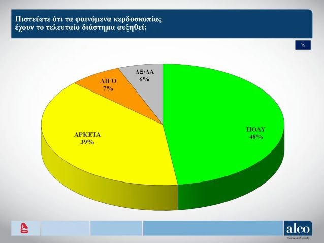 Το 87% των πολιτών θεωρεί ότι έχουν αυξηθεί αρκετά έως πολύ τα φαινόμενα αισχροκέρδειας στην αγορά ενώ μόλις το 22% αισθάνεται ότι η οικογένεια του θα στηριχθεί από το καλάθι της νοικοκυράς.