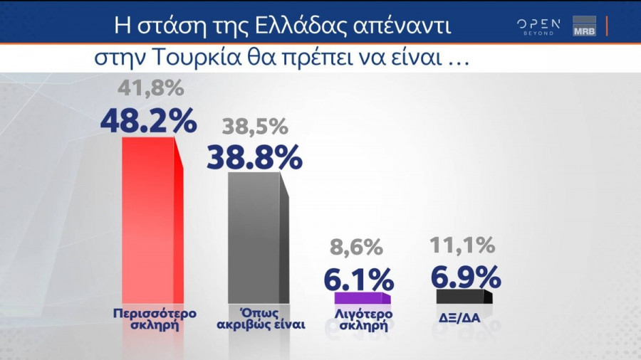Τέλος, αναφορικά με τη στάση της Ελλάδας απέναντι στην Τουρκία το 48,2% θεωρεί πως πρέπει να γίνει περισσότερο σκληρή, το 38,8% ότι πρέπει να παραμείνει ως έχει ενώ ένα 6,1% απάντησε ότι πρέπει να γίνει λιγότερο σκληρή.