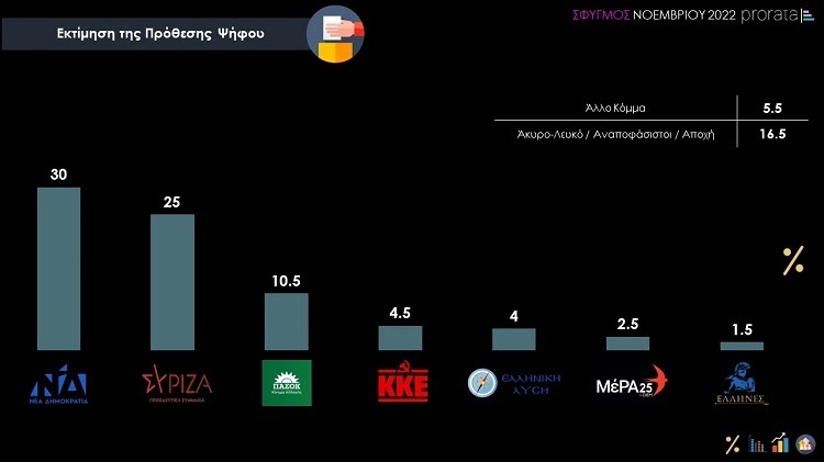 Σύμφωνα με τον Σφυγμό Νοεμβρίου 2022, την τελευταία μέτρηση ανίχνευσης πολιτικών στάσεων και εκλογικής συμπεριφοράς της Prorata η πρόθεση ψήφου προς τη Νέα Δημοκρατία καταγράφεται στο 30%, προς τον ΣΥΡΙΖΑ-ΠΣ στο 25%, ενώ προς το ΠΑΣΟΚ-ΚΙΝΑΛ στο 10.5%. Η εκλογική επιρροή του ΚΚΕ ανιχνεύεται στο 4.5%, της Ελληνικής Λύσης στο 4% και του ΜεΡΑ25 στο 2.5%.