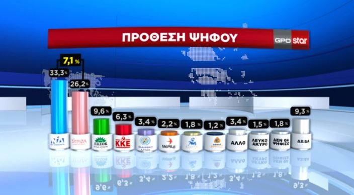 Στις 7,1 ποσοστιαίες μονάδες μετρά τη διαφορά της Νέας Δημοκρατίας από τον ΣΥΡΙΖΑ, δημοσκόπηση της GPO για λογαριασμό του STAR.