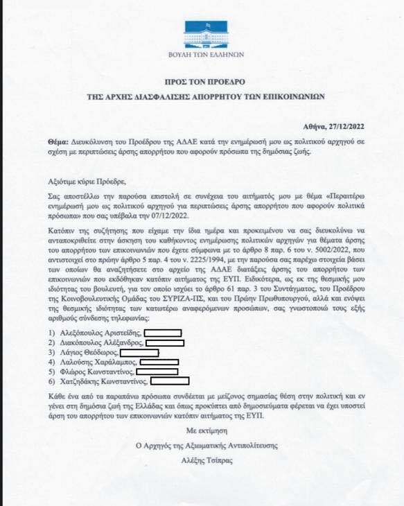 Στη δημοσιότητα έδωσαν πηγές που βρίσκονται κοντά στον πρόεδρο του ΣΥΡΙΖΑ, την επιστολή που παρέδωσε στις αρχές Δεκεμβρίου ο Αλέξης Τσίπρας, προς τον επικεφαλής της ΑΔΑΕ, Χρήστο Ράμμο, η οποία έδωσε και το έναυσμα για την έρευνα της Ανεξάρτητης Αρχής για τις παρακολουθήσεις του Κωστή Χατζηδάκη και των πέντε στελεχών των Ενόπλων Δυνάμεων.