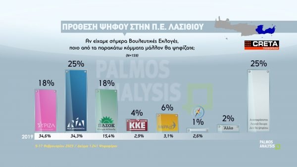 Στην Περιφερειακή Ενότητα Λασιθίου το 25% των ερωτηθέντων δήλωσε πως θα ψήφιζε Νέα Δημοκρατία, το 18% ΣΥΡΙΖΑ, το 18% ΠΑΣΟΚ, το 6% Μέρα25, το 4% ΚΚΕ και το 1% Ελληνική Λύση.