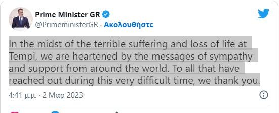 Με ένα μήνυμα γραμμένο στα αγγλικά το οποίο ανάρτησε στο Twitter, ο πρωθυπουργός Κυριάκος Μητσοτάκης, ευχαρίστησε όλους όσοι έστειλαν μηνύματα στήριξης και συμπαράστασης στην Ελλάδα για την τραγωδία στα Τέμπη.