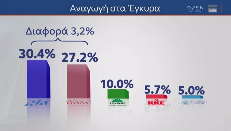 Δημοσκόπηση MRB: Μπροστά με 3,2 μονάδες η Νέα Δημοκρατία έναντι του ΣΥΡΙΖΑ