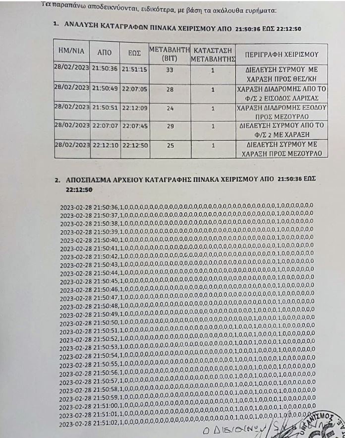 Στα έγγραφα αποδεικνύεται ότι όλα τα δρομολόγια έγιναν με αυτόματη χάραξη εκείνη τη μέρα έως τις 22:12 πριν αναλάβει ο συγκεκριμένος Σταθμάρχης και προκαλέσει το δυστύχημα. Επιπλέον, υπήρξε και δοκιμαστικό δρομολόγιο που έγινε στη 1 τα ξημερώματα με αυτόματη χάραξη. Δηλαδή, μετά το δυστύχημα. Αυτά είναι τα έγγραφα