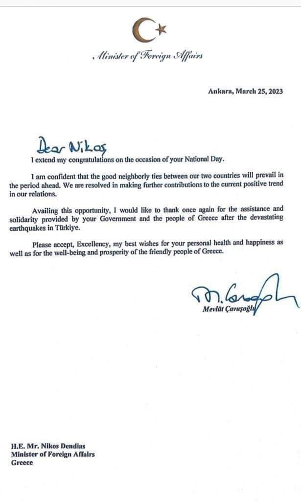 Επίσης, ο Υπουργός Εξωτερικών της Τουρκίας, Μεβλούτ Τσαβούσογλου, απέστειλε από το πρωί ευχετήρια επιστολή στον Έλληνα Υπουργό Εξωτερικών, Νίκο Δένδια, για την Εθνική Εορτή της 25ης Μαρτίου.