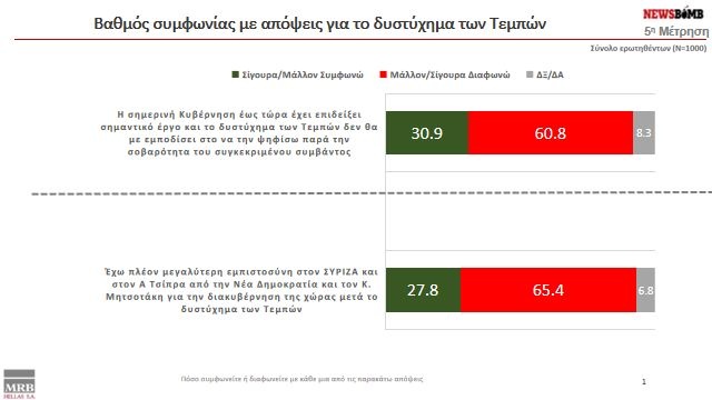 Από τα στοιχεία της MRB προκύπτει ότι οι πολίτες επιρρίπτουν διαχρονικά, αλλά και στη σημερινή κυβέρνηση ευθύνες για το δυστύχημα των Τεμπών.