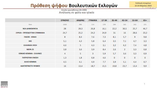 Όπως φαίνεται από τα στοιχεία της έρευνας της MRB για την πρόθεση ψήφου επί των βουλευτικών εκλογών και για το διάστημα από 24 έως 28 Μαρτίου του 2023 η διαφορά των δύο πρώτων κομμάτων κινείται στο 3,3%. Η Νέα Δημοκρατία βρίσκεται στο 28% και ο ΣΥΡΙΖΑ στο 24,7%. Παράλληλα φαίνεται να μπαίνουν στη Βουλή τόσο το κόμμα «Έλληνες Εθνικό Κόμμα» του Ηλία Κασιδιάρη, όσο και το ΜεΡΑ25 του Γιάνη Βαρουφάκη. Αξίζει να σημειώσουμε ότι στην προηγούμενη συλλογή στοιχείων που έγινε για το διάστημα από 6 έως 13 Μαρτίου του 2023 η διαφορά των δύο κομμάτων κινείται στο 2,9% με τη Νέα Δημοκρατία στο 27,4% και τον ΣΥΡΙΖΑ στο 24,5%.