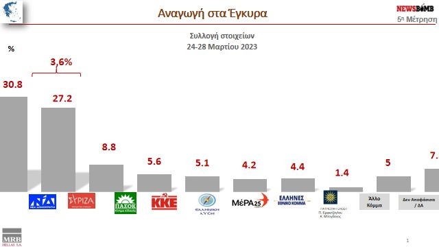 Για το διάστημα 24 έως 28 Μαρτίου του 2023 και σε ότι αφορά την αναγωγή επί των εγκύρων ψηφοδελτίων φαίνεται η Νέα Δημοκρατία να αγγίζει το 30,8% και ο ΣΥΡΙΖΑ να βρίσκεται στο 27,2%. Η διαφορά δηλαδή διαμορφώνεται στο 3,6%. Στα ίδια ποσοστά εμφανίζονται τα δύο μεγάλα κόμματα και στην προηγούμενη μέτρηση που έγινε 6 με 13 Μαρτίου με τη διαφορά μεταξύ τους επί των εγκύρων να βρίσκεται στο 3,2%. Υπάρχει όμως επί της ουσίας μία μικρή αύξηση της ψαλίδας υπέρ της Νέας Δημοκρατίας και είναι της τάξης του 0,4%. Σε ότι δε αφορά τις αναγωγές επί του συνόλου εις τις οποίες συμπεριλαμβάνονται και η αδιευκρίνιστη ψήφος, η ψαλίδα για τις τελευταίες μέρες του Μαρτίου φαίνεται να διαμορφώνεται στο 3,9%. Η Νέα Δημοκρατία φτάνει στο 33,3% και ο ΣΥΡΙΖΑ στο 29,4%. Στο προηγούμενο διάστημα της μέτρησης που έγινε 6 με 13 Μαρτίου και στην αναγωγή επί του συνόλου η ψαλίδα ήταν ακόμη πιο κάτω στο 3,5% μεταξύ Νέας Δημοκρατίας και ΣΥΡΙΖΑ.