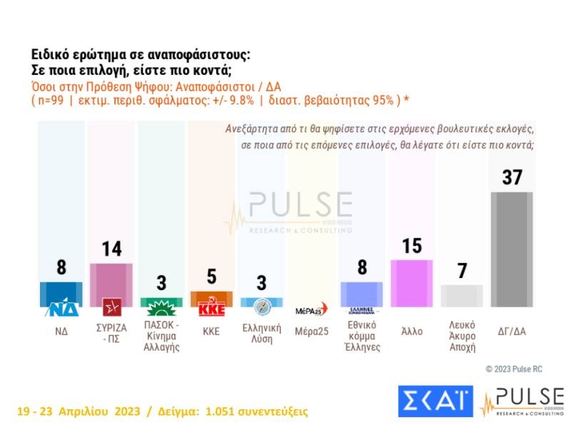 Επίσης, στο ερώτημα «Σε ποια επιλογή είστε πιο κοντά;» το 37% εξ αυτών επέμειναν στο «δεν ξέρω/δεν απαντώ», το 7% επιλέγει λευκό/άκυρο/αποχή. Το 8% δηλώνει ότι είναι πιο κοντά στη ΝΔ, το 14% πιο κοντά στον ΣΥΡΙΖΑ, το 3% πιο κοντά στο ΠΑΣΟΚ-ΚΙΝΑΛ, το 5% πιο κοντά στο ΚΚΕ, το 3% πιο κοντά στην Ελληνική Λύση, το 8% πιο κοντά στο Εθνικό Κόμμα Ελληνες, ενώ «άλλο» δηλώνει το 15% των αναποφάσιστων.