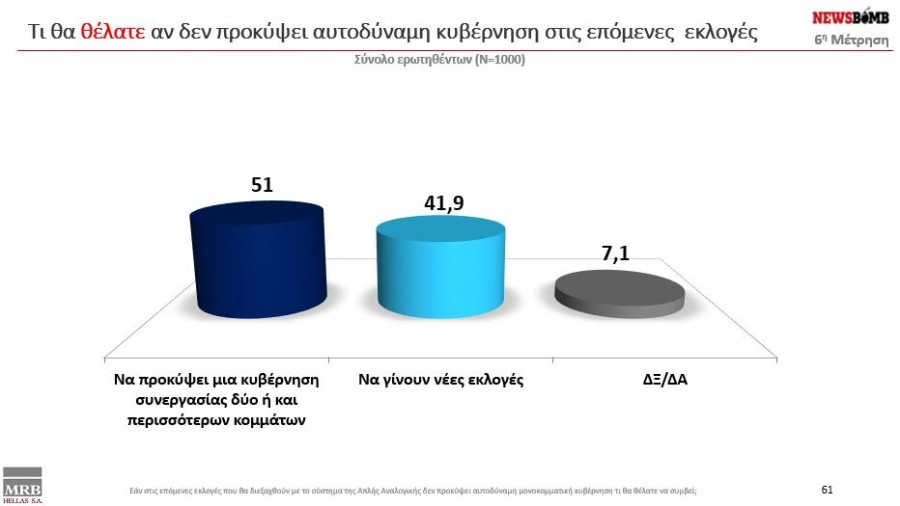 Η απάντηση «Να προκύψει κυβέρνηση συνεργασίας δύο ή και περισσότερων κομμάτων» συγκεντρώνει το 51% ενώ η απάντηση «Να γίνουν νέες εκλογές» επιλέχθηκε από το 41,9%. Αρκετά μεγάλο είναι το ποσοστό όσων δεν έδωσαν απάντηση στο ερώτημα, καθώς ανέρχεται στο 7,1%.