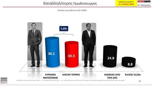 Δημοσκόπηση: Προβάδισμα 5 μονάδων της ΝΔ έναντι του ΣΥΡΙΖΑ δείχνει η πρόθεση ψήφου της MRB για το διάστημα 11 – 12 Μαϊου – Μεγάλο άνοιγμα της γαλάζιας παράταξης στην παράσταση νίκης