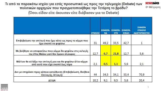 Ωστόσο, το 12.7% δήλωσε ότι το debate τους βοήθησε να αποφασίσουν ποιο κόμμα να ψηφίσουν, γιατί δεν ήταν σίγουροι και το 2.1% θα ψηφίσει κάτι άλλο από ότι σκόπευε αρχικώς, λόγω της τηλεμαχίας.