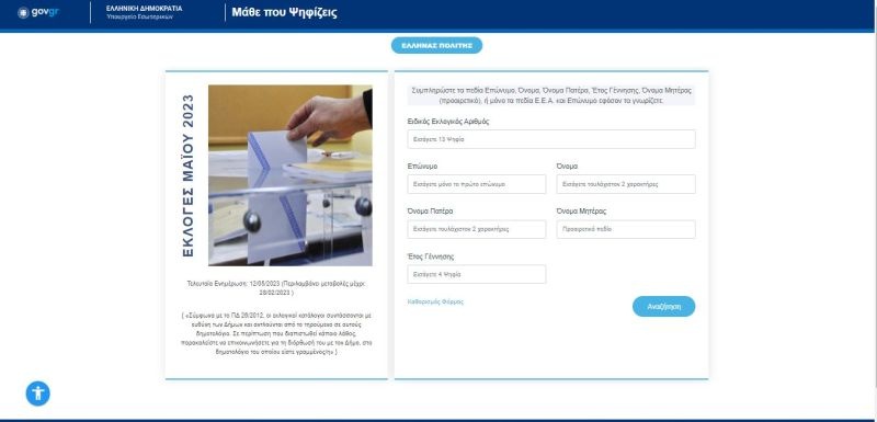 Ακόμα και αν ο πολίτης δεν θυμάται τον ειδικό εκλογικό αριθμό του, συμπληρώνοντας το επώνυμο, το όνομα, το πατρώνυμο και το όνομα μητρός θα του επιστραφούν επακριβώς όλα τα αποτελέσματα. Έτσι, με μερικά κλικ πληροφορείται κανείς και τον Ειδικό Εκλογικό Αριθμό αλλά και τον κωδικό του Εκλογικού Διαμερίσματος. Το Εκλογικό Τμήμα αναγράφεται λεπτομερώς και μάλιστα παρέχεται η δυνατότητα να το βρει κανείς και στον χάρτη πατώντας πάνω στη σχετική ένδειξη.