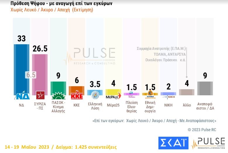 Η δημοσκόπηση της Pulse για τον ΣΚΑΪ καταγράφει προβάδισμα 6,5 ποσοστιαίες μονάδες στη ΝΔ έναντι του ΣΥΡΙΖΑ. Αναλυτικότερα, σύμφωνα με τη δημοσκόπηση, η ΝΔ με αναγωγή επί των εγκύρων λαμβάνει στην πρόθεση ψήφου 33%, ο ΣΥΡΙΖΑ 26,5%, το ΠΑΣΟΚ- ΚΙΝΑΛ 9%, το ΚΚΕ 6%, στο 3,5% είναι η Ελληνική Λύση, στο 4% το ΜέΡΑ25 και ακολουθούν με 1,5% η Πλεύση Ελευθερίας, αλλά και η Εθνική Δημιουργία και στο 2% η ΝΙΚΗ. Οι αναποφάσιστοι φτάνουν στο 9%, ενώ μικρότερα κόμματα επιλέγει το 4% των ερωτηθέντων.