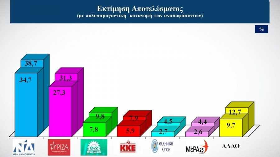 Συγκεκριμένα, η Νέα Δημοκρατία στην εκτίμηση ψήφου συγκεντρώνει ποσοστό 34,7% έως 38,7%, ενώ ακολουθεί ο ΣΥΡΙΖΑ - ΠΣ με ποσοστό 27,3% έως 31,3%.