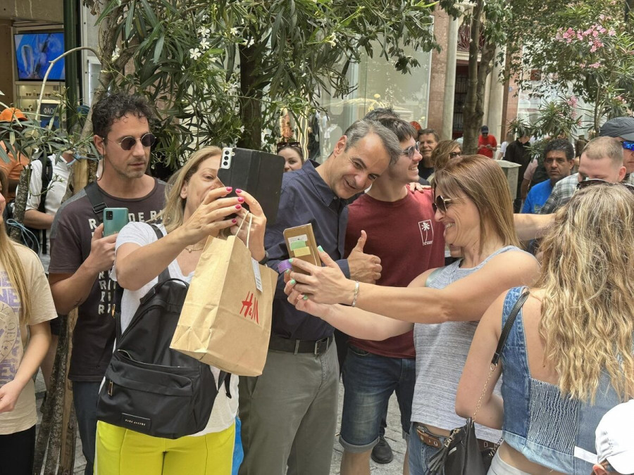 Προσερχόμενος στη συνάντηση που πραγματοποιήθηκε σε καφέ στο κέντρο της Ερμού, ο Κυριάκος Μητσοτάκης είχε σύντομες συνομιλίες με τουρίστες με τους οποίους έβγαλε selfies.