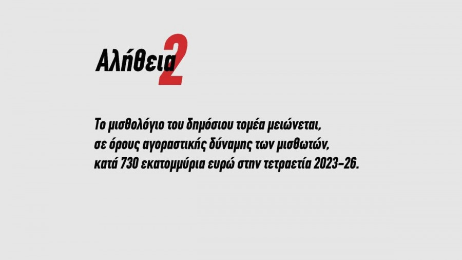 Προχωρώντας στη δεύτερη αλήθεια, όπως είπε σημείωσε πως "σύμφωνα με το Πρόγραμμα Σταθερότητας, οι δαπάνες του μισθολογίου του δημόσιου τομέα σε σταθερές τιμές - δηλαδή σε όρους αγοραστικής δύναμης των μισθωτών του δημόσιου τομέα μειώνονται μεταξύ 2023 και 2026 συνολικά κατά 730 εκατομμύρια ευρώ, καθώς δεν υπάρχει καμία πρόνοια αποζημίωσης των μισθωτών του δημοσίου από τις εισοδηματικές απώλειες που προκαλεί ο πληθωρισμός". 'Αρα, τόνισε, "οι πραγματικοί μισθοί των δημοσίων υπαλλήλων, όχι μόνο να μην αυξηθούν, αλλά να μειωθούν", όπως "προβλέπει το αληθινό πρόγραμμα της ΝΔ".
