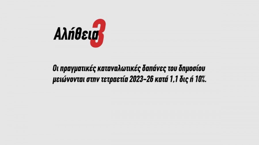 Ως "τρίτη αλήθεια", ανέφερε πως "σύμφωνα με τους αριθμούς του Προγράμματος Σταθερότητας, οι πρωτογενείς καταναλωτικές δαπάνες του δημοσίου", δηλαδή "οι δημόσιες δαπάνες που καλύπτουν την δημόσια παιδεία, την υγεία, την πολιτική προστασία, την ασφάλεια των πολιτών, μεταξύ 2023 και 2026, σε ονομαστικούς όρους, παραμένουν στάσιμες στα επίπεδα των 11,6 δις ευρώ".