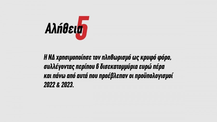 Όσον αφορά την "πέμπτη αλήθεια", καταλόγισε για ακόμα μία φορά στη ΝΔ ότι "χρησιμοποίησε σκόπιμα τον πληθωρισμό ως κρυφό φόρο - τον πλέον αντίστροφα προοδευτικό φόρο - συλλέγοντας έτσι περίπου 6 δισεκατομμύρια ευρώ πέρα και πάνω από αυτά που προέβλεπαν οι προϋπολογισμοί 2022 και 2023".