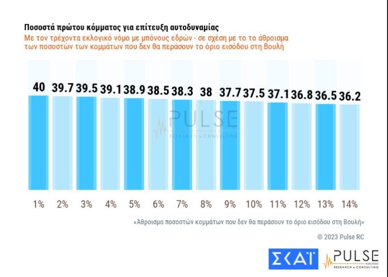 Η έρευνα της Pulse παρουσίασε όλα τα σενάρια, ακόμη και για Βουλή με εννέα κόμματα. Το βασικό σενάριο προβλέπει 7 κόμματα, με αυτοδυναμία πάντα της Νέας Δημοκρατίας. Οι έδρες αναμένεται να κυμαίνονται από 155 έως και 166, ανάλογα με τον αριθμό των κομμάτων που θα «πιάσουν» το όριο για την είσοδό τους στη Βουλή.