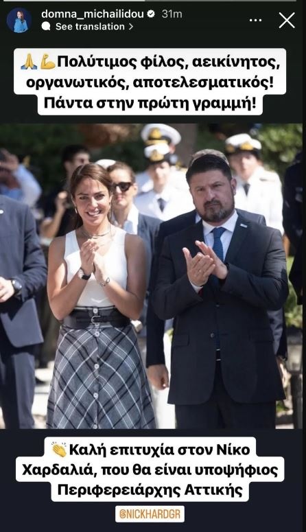 «Πολύτιμος φίλος, αεικίνητος, οργανωτικός, αποτελεσματικός! Πάντα στην πρώτη γραμμή! Καλή επιτυχία στον Νίκο Χαρδαλιά», έγραψε η υφυπουργός Παιδείας, Δόμνα Μιχαηλίδου, σε story στο Instagram.