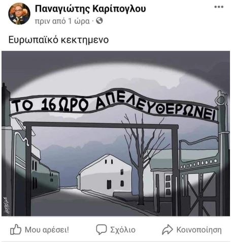 Στην ανάρτησή του, την οποία απέσυρε υπο το βάρος των έντονων αντιδράσεων, ο κ. Καρίπογλου παρουσιάζει ένα σκίτσο με την είσοδο του στρατοπέδου Άουσβιτς και την επιγραφή «το 16ωρο απελευθερώνει».