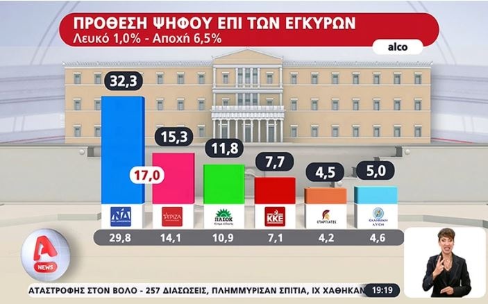 Στην πρόθεση ψήφου η διαφορά είναι χαοτική, με τη Νέα Δημοκρατία να φτάνει στο 32,3% έναντι του ισχνού 15,3% του ΣΥΡΙΖΑ, μια διαφορά που μεταφράζεται στις 17 μονάδες!