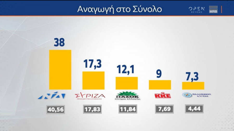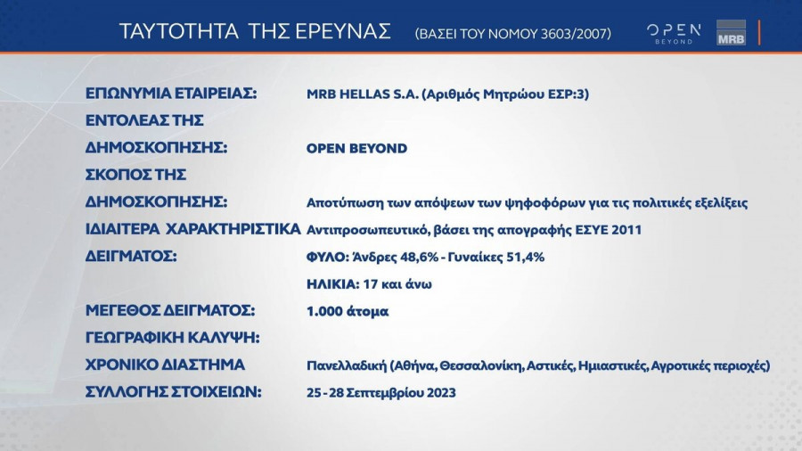 Η Νέα Δημοκρατία εξακολουθεί να έχει προβάδισμα περίπου 21 μονάδων από τον ΣΥΡΙΖΑ, σύμφωνα με τη δημοσκόπηση της MRB για το κεντρικό δελτίο ειδήσεων του Open.