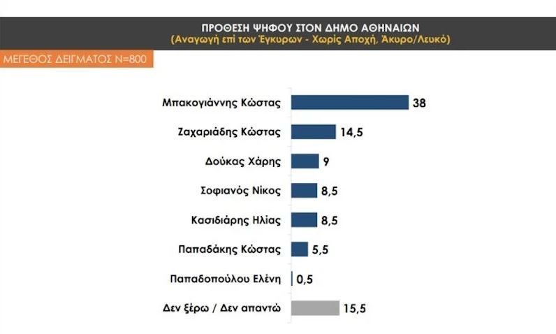 Στην τελευταία έρευνα της Prorata, για λογαριασμό του Attica TV, ο Κώστας Μπακογιάννης έχει προβάδισμα με 38%, ενώ ακολουθεί ο Κώστας Ζαχαριάδης με 14,5%. Ο Χάρης Δούκας έπεται με 9%, ενώ ο Ηλίας Κασιδιάρης συγκεντρώνει 8,5% καταγράφοντας αύξηση στα ποσοστά σε σχέση με τις πρώτες δημοσκοπήσεις. Στο 8,5% και το ποσοστό του Νίκου Σοφιανού, ενώ ο Κώστας Παπαδάκης λαμβάνει 5,5%.