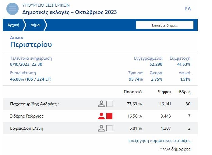 Προς την έκτη επανεκλογή του στο δήμο Περιστερίου οδεύει ολοταχώς ο Ανδρέας Παχατουρίδης, καθώς με την ενσωμάτωση πάνω από το 48% συγκεντρώνει το 77,63% των ψήφων.