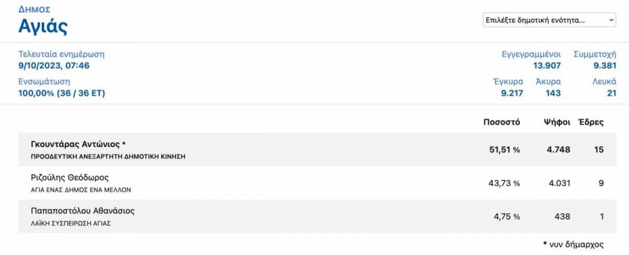 Ακόμα μια νίκη στις δημοτικές εκλογές μετρά ο δήμαρχος Αγιάς, Αντώνης Γκουντάρας, ο οποίος επανεξελέγη την Κυριακή 8 Οκτωβρίου με ποσοστό 51,51%.