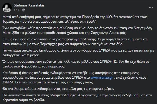 «Μετά από εισήγησή μου, σήμερα το απόγευμα το Προεδρείο της Κ.Ο. θα ανακοινώσει τους Τομεάρχες που θα υπεραμύνονται της αλήθειας στη Βουλή.Έχω καταβάλει κάθε προσπάθεια η σύνθεση να είναι όσο το δυνατόν ενωτική και διευρυμένη. Με πυξίδα το μέλλον του προοδευτικού χώρου και της Σύγχρονης Αριστεράς.Όπως έχω ήδη ανακοινώσει, η κύρια παραγωγή πολιτικής θα μεταφερθεί στα τμήματα και στην κοινωνία, με τους Τομεάρχες μας να συμμετέχουν ενεργά και στα δύο.Για να είμαι απολύτως ξεκάθαρος απέναντι στον κόσμο του ΣΥΡΙΖΑ που με εμπιστεύεται και με ενθαρρύνει κάθε μέρα:Όποιος υπονομεύσει την ενότητα της Κ.Ο. και το μέλλον του ΣΥΡΙΖΑ-ΠΣ, δεν θα έχει θέση σε μελλοντικά ψηφοδέλτια του κόμματος.Και όποια ή όποιος από εσάς ενδιαφέρεται να κατέβει ως υποψήφιος στις επικείμενες Ευρωεκλογές, πρέπει να γραφτεί μέλος του ΣΥΡΙΖΑ στο www.isyriza.gr . Εκεί χτίζεται ο νέος ΣΥΡΙΖΑ. Εκεί γεννιούνται τα στελέχη της επόμενης γενιάς.Θα στείλουμε φόρμα ενδιαφέροντος στα μέλη μας τις επόμενες μέρες. Θα λογοδοτώ πάντα σε εσάς αδιαμεσολάβητα. Αρχίζοντας με την ανοιχτή εκδήλωσή μας στο Κερατσίνι αύριο το βράδυ».