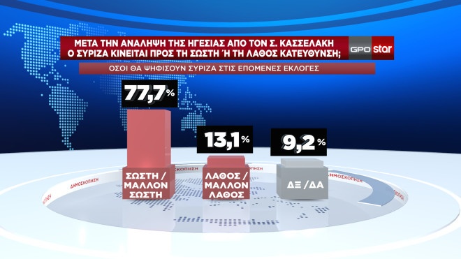 Επίσης, μεταξύ όσων δηλώνουν ότι θα ψηφίσουν ΣΥΡΙΖΑ στις επόμενες εκλογές το 76,2% θεωρεί ότι η στάση των κ.κ. Φίλη, Σκουρλέτη και Τζουμάκα δεν συμβάλει στην ενότητα του κόμματος και το 77,7% θεωρεί ότι ο ΣΥΡΙΖΑ μετά την ανάληψη της ηγεσίας από τον κ. Κασσελάκη κινείται στη σωστή και μάλλον στη σωστή κατεύθυνση.