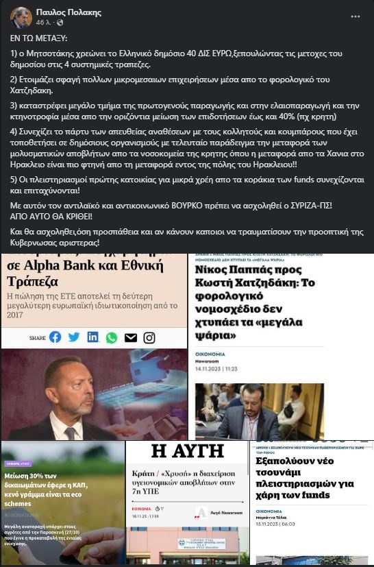 Στην ανάρτησή του επιτίθεται στην κυβέρνηση και καλεί τον ΣΥΡΙΖΑ να ασχοληθεί με τον «αντιλαϊκό και αντικοινωνικό βούρκο» γιατί όπως υποστηρίζει από αυτό θα κριθεί