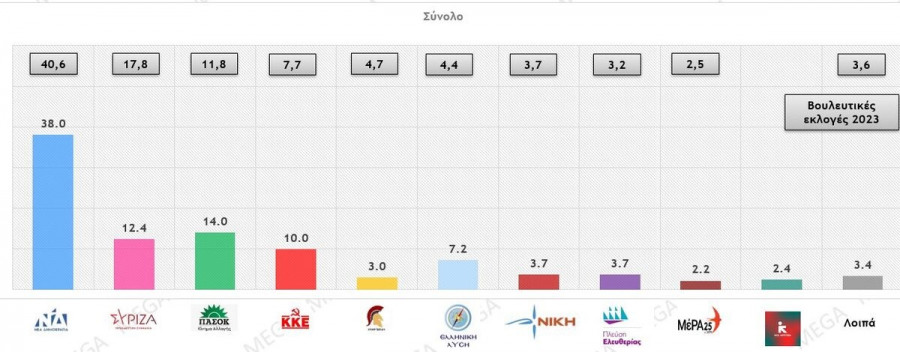 Σύμφωνα με τη δημοσκόπηση, εάν είχαμε εκλογές τώρα, πρώτη θα έβγαινε με διαφορά η Νέα Δημοκρατία. Ακολουθούν τα ποσοστά της δημοσκόπησης: