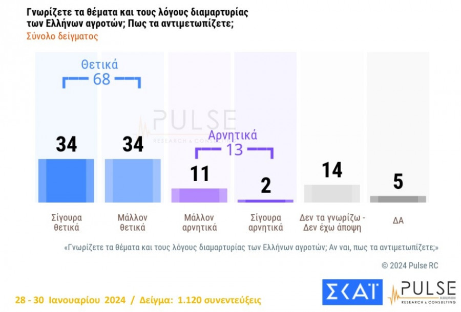 Το 68% των πολιτών στη δημοσκόπηση της PULSE για τον ΣΚΑΪ δίνει θετικές απαντήσεις αναφορικά με τους λόγους διαμαρτυρίας των αγροτών, που σημαίνει ότι η πλειοψηφία συμφωνεί με τα αιτήματά τους.